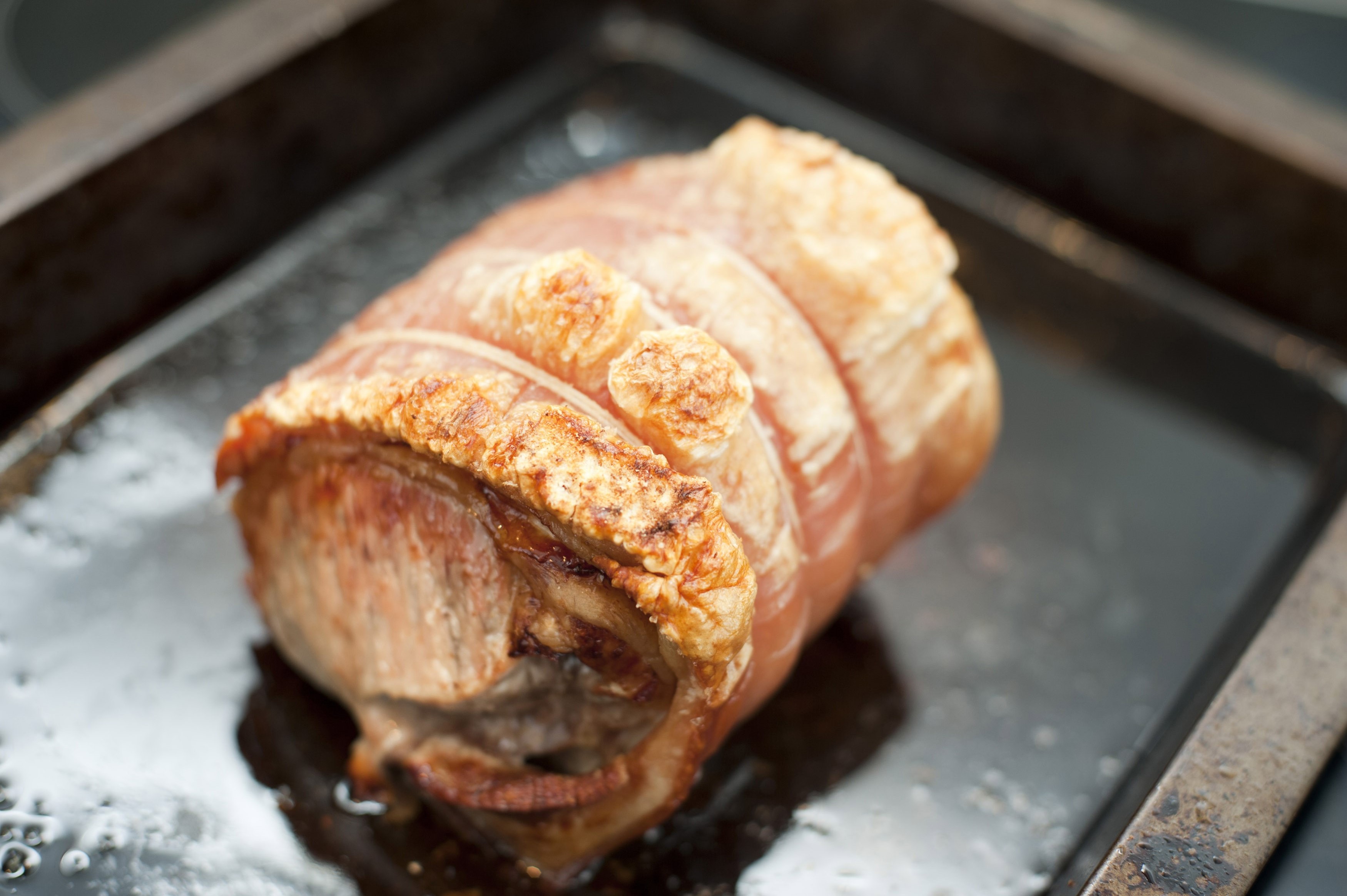 Crisp pork crackling on a roll of oven roasted pork in a grill pan