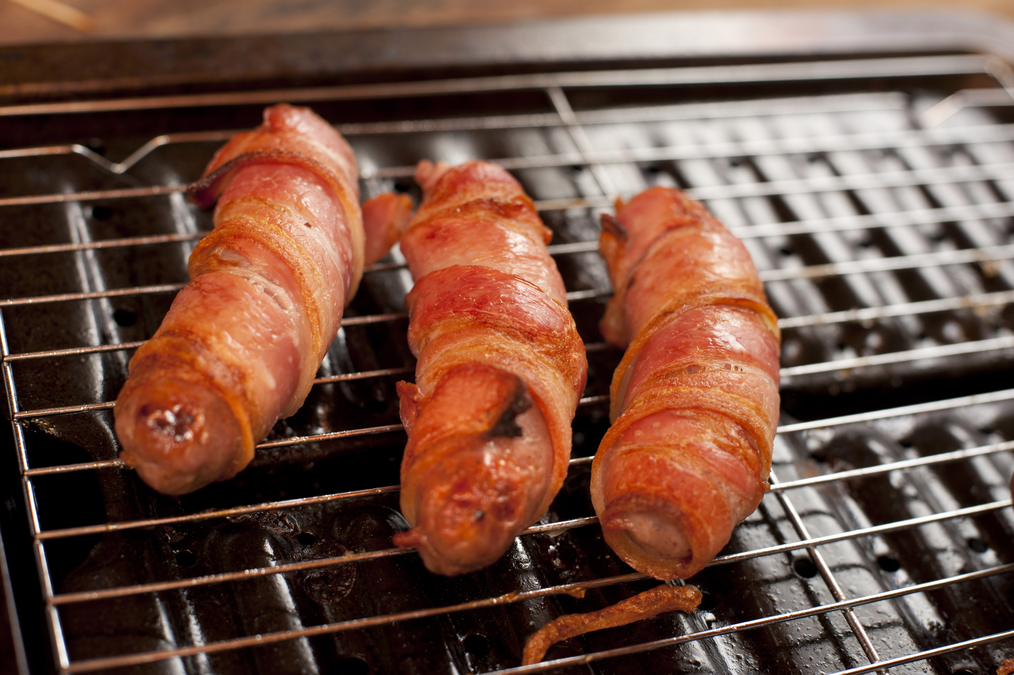 Pork sausage and bacon rolls, or traditional pigs in blankets, on a grill in close up
