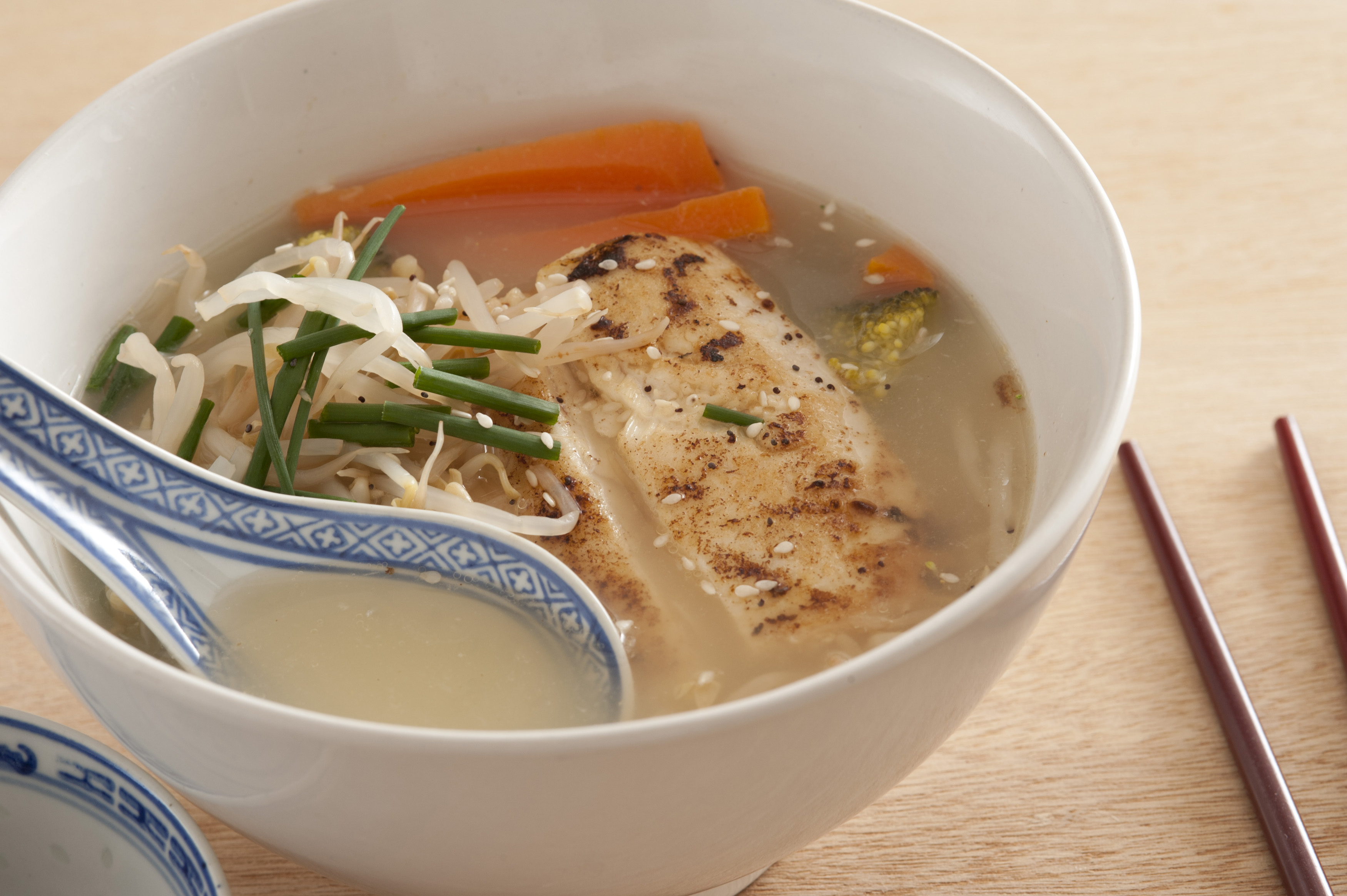 Asian soup made of grilled meat in clear broth, carrot sticks, chives, sliced onions and with a decorative ceramic spoon