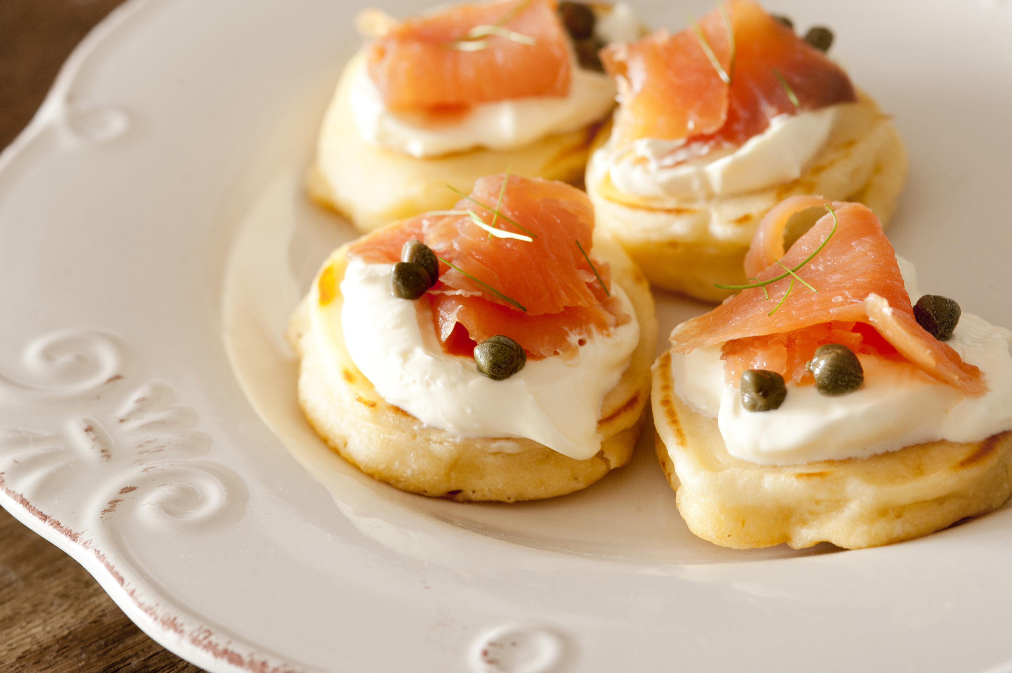 Four raw fish and cheese blini snacks with capers and herbs on white glossy ceramic plate