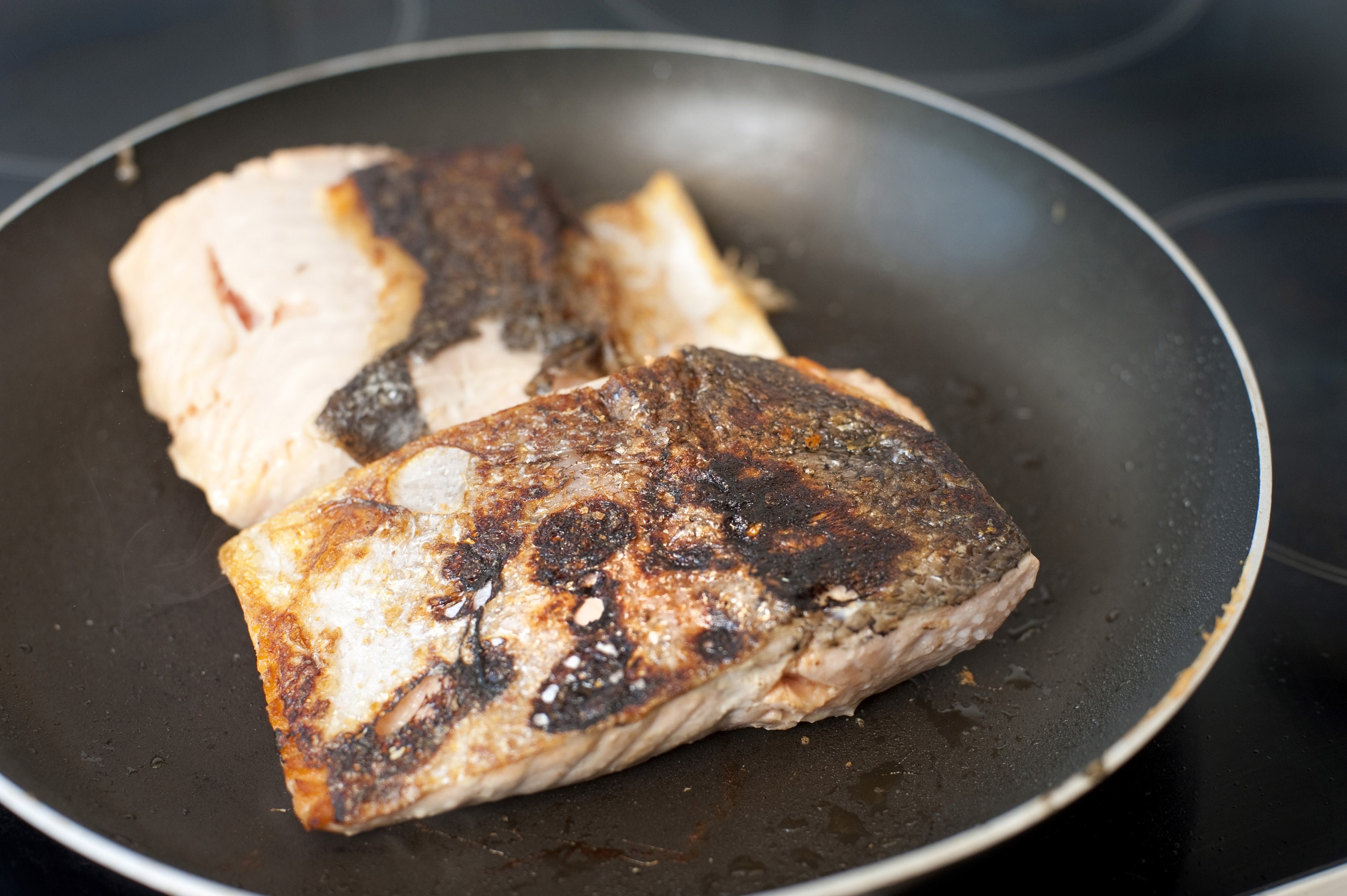 Searing salmon fish fillet steaks in a pan over the stove while pan-frying a delicious healthy seafood dinner