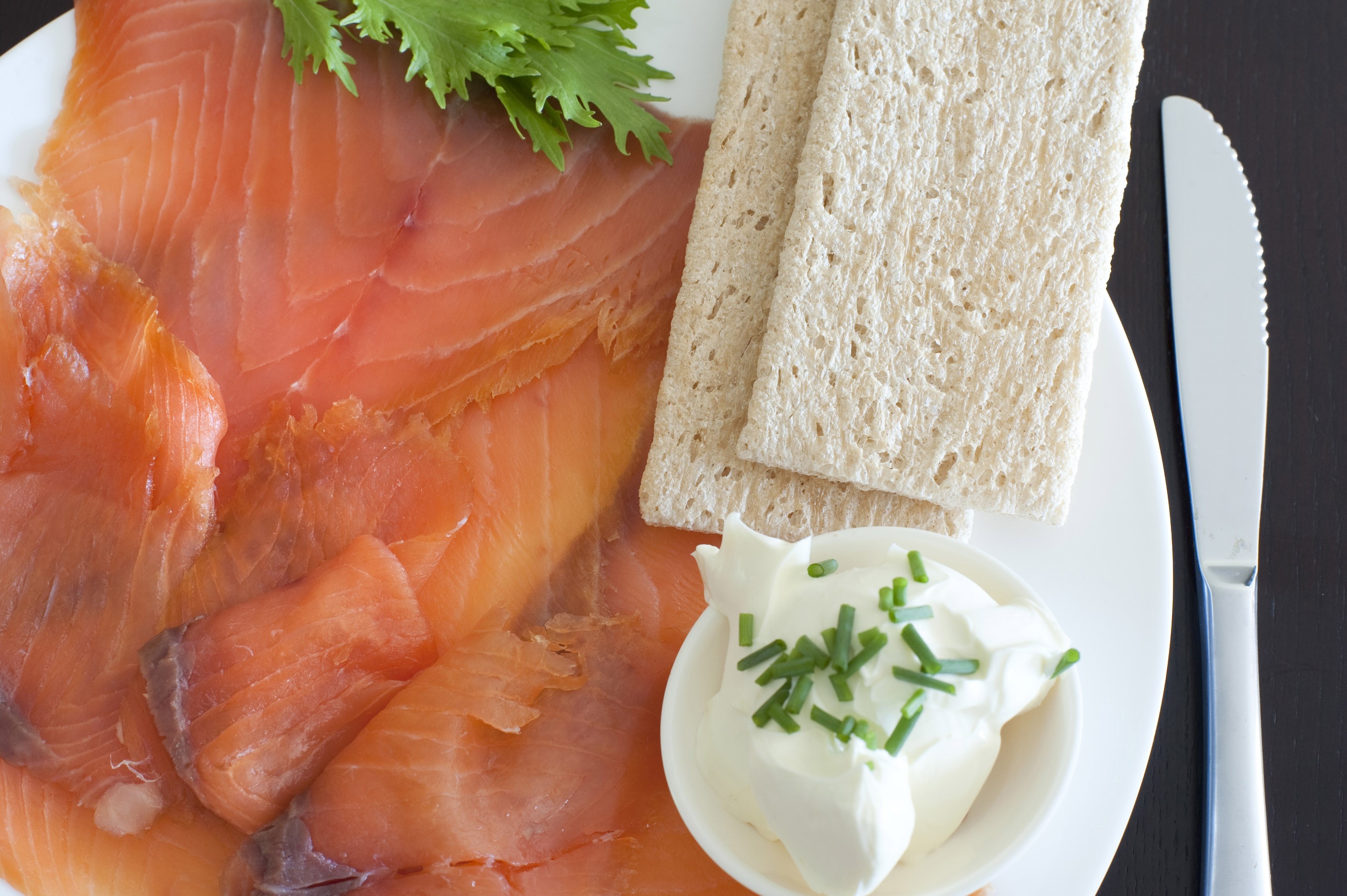 Gravalax, or thinly sliced cured and smoked salmon, with cream cheese and crispbread, close up overhead view