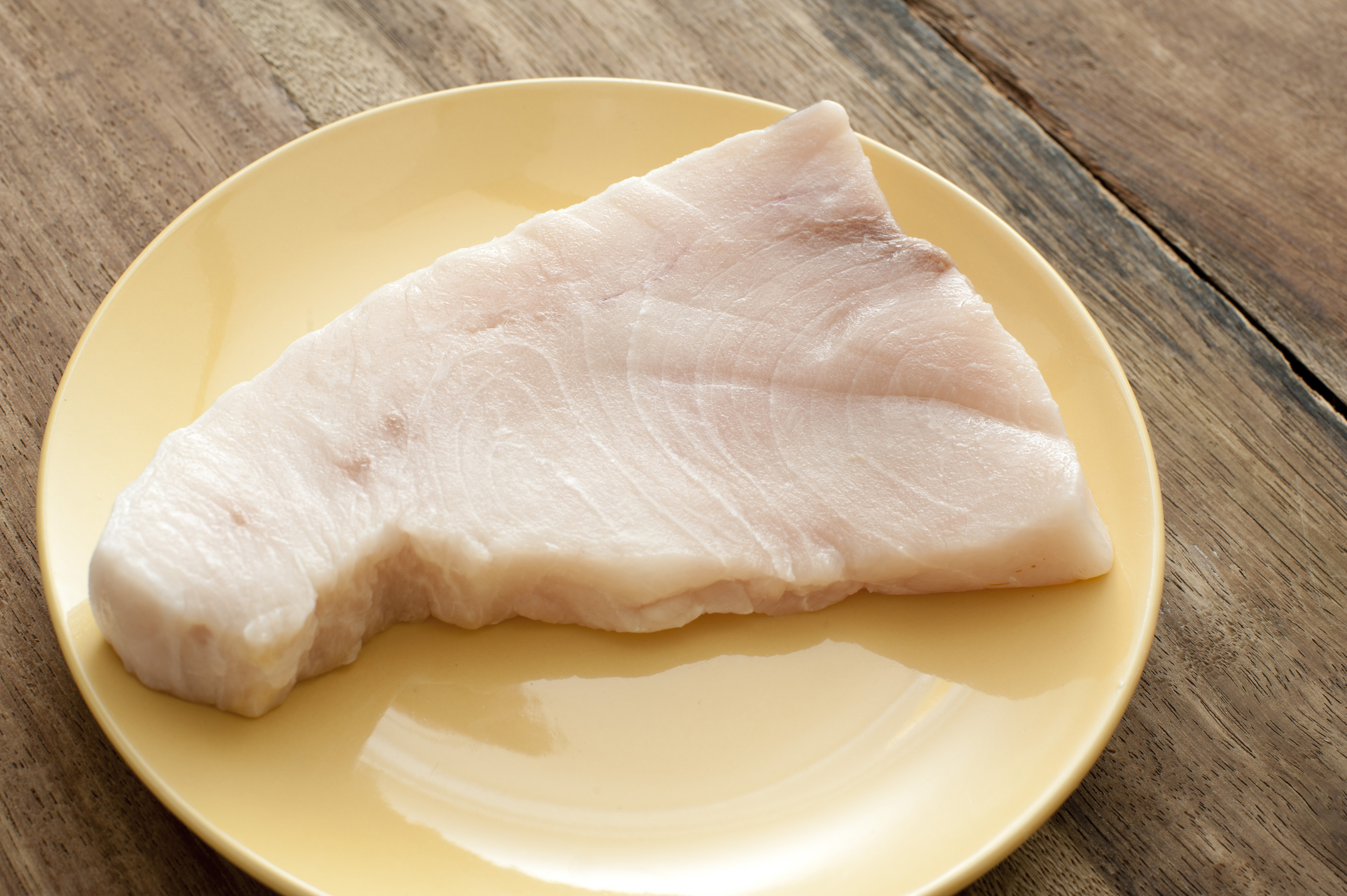 First person perspective view on large piece of raw swordfish in middle of yellow circular plate over dark wooden table