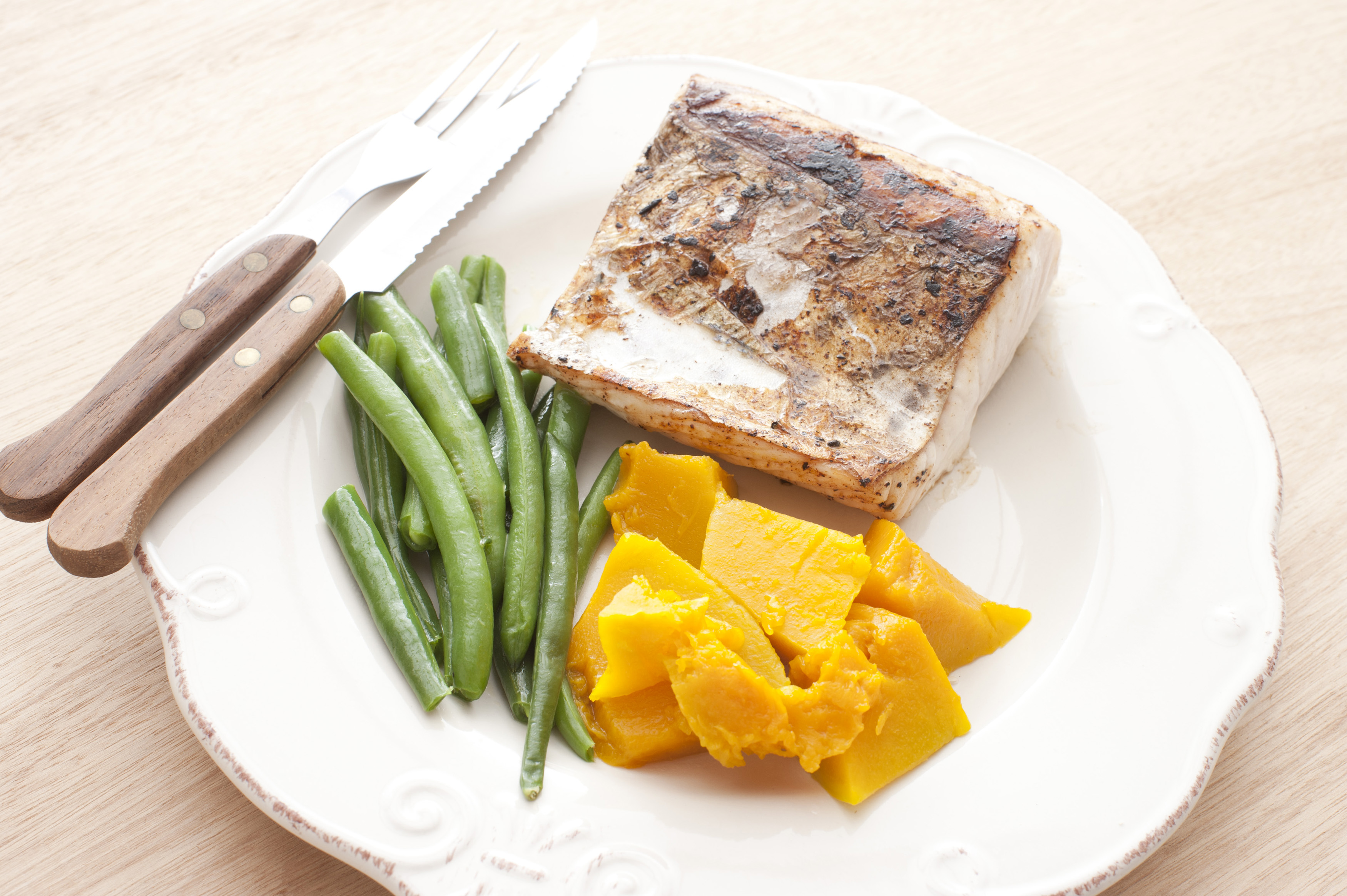 Single square shaped fillet of cooked mackerel, green string beans and yellow squash on plate with fork and knife over wooden table