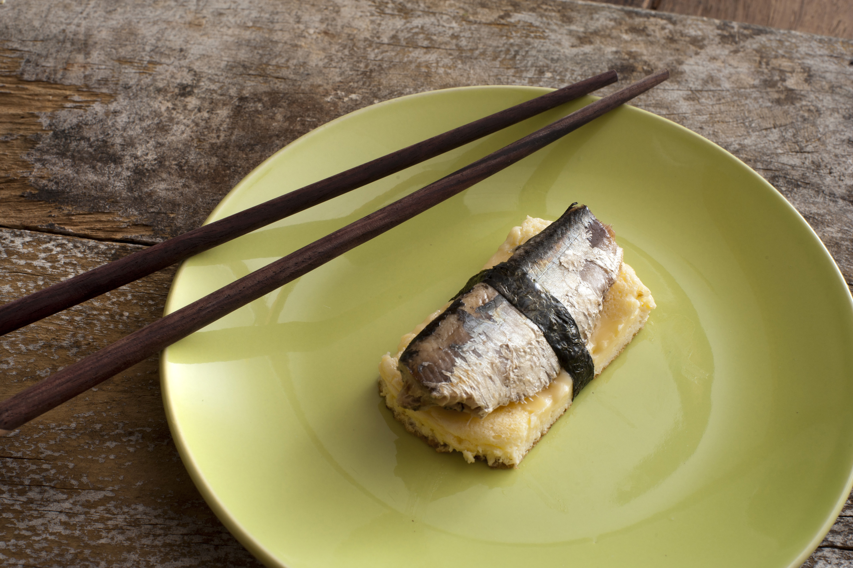 Pair of dark brown chopsticks on round green plate of omelete or tamagoyaki and fish bound together with seaweed over rustic wooden table