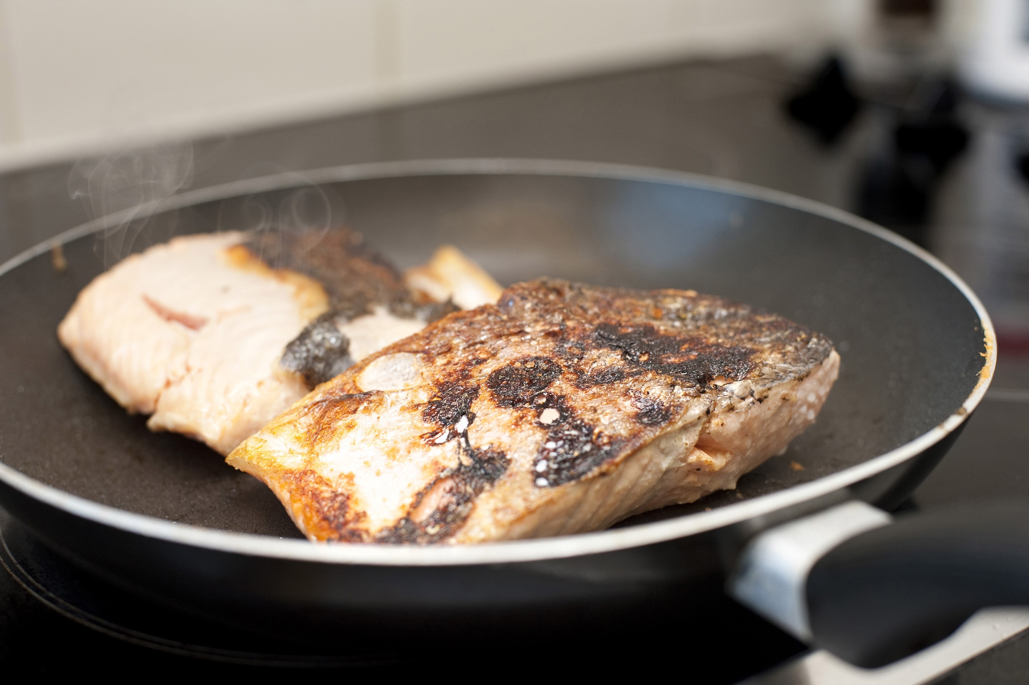 Fresh salmon steaks searing in the hot pan while preparing a healthy seafood dinner over the stove