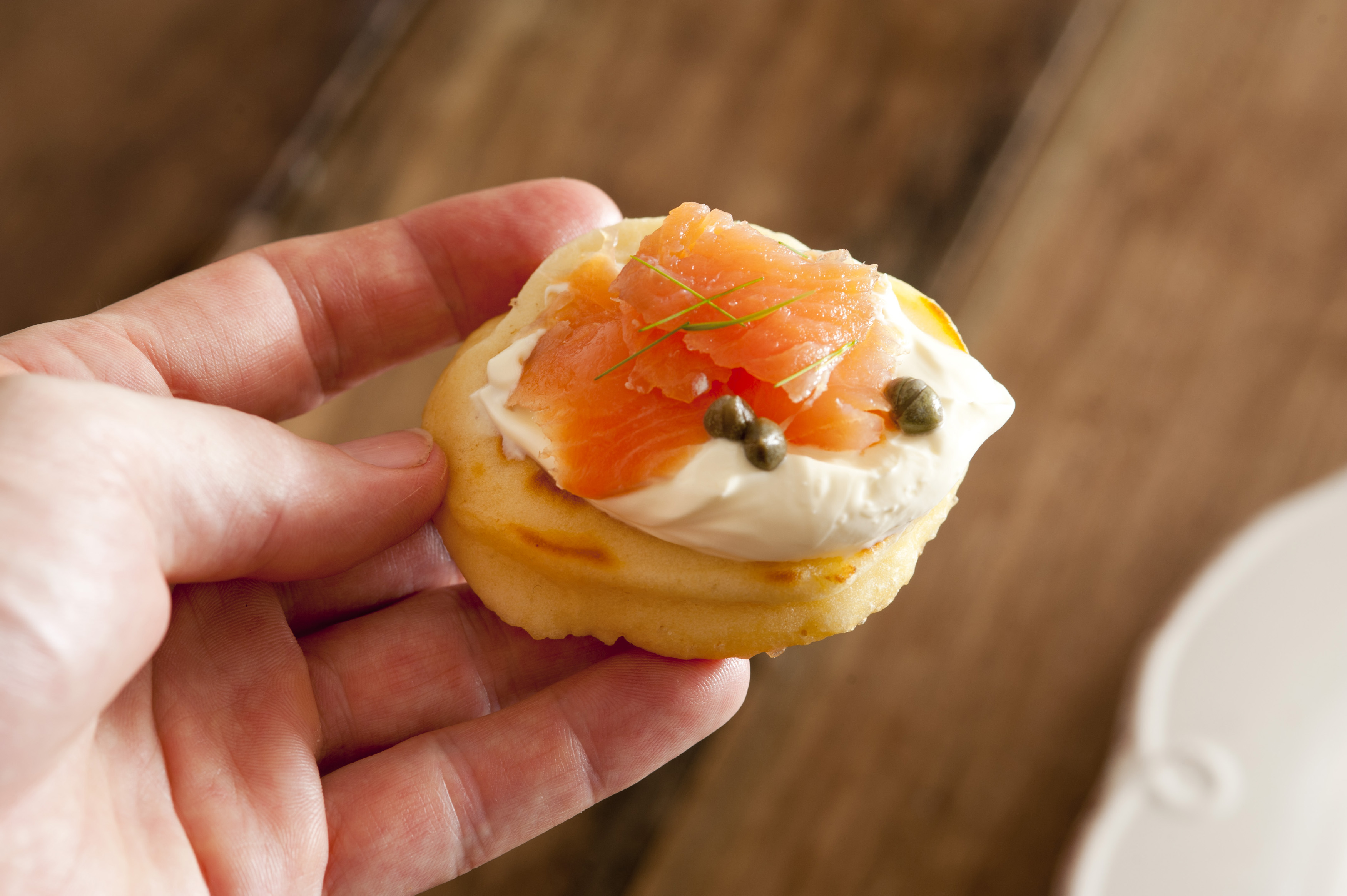 First person view of person eating a blini appetizer with cream, pink salmon and capers in hand