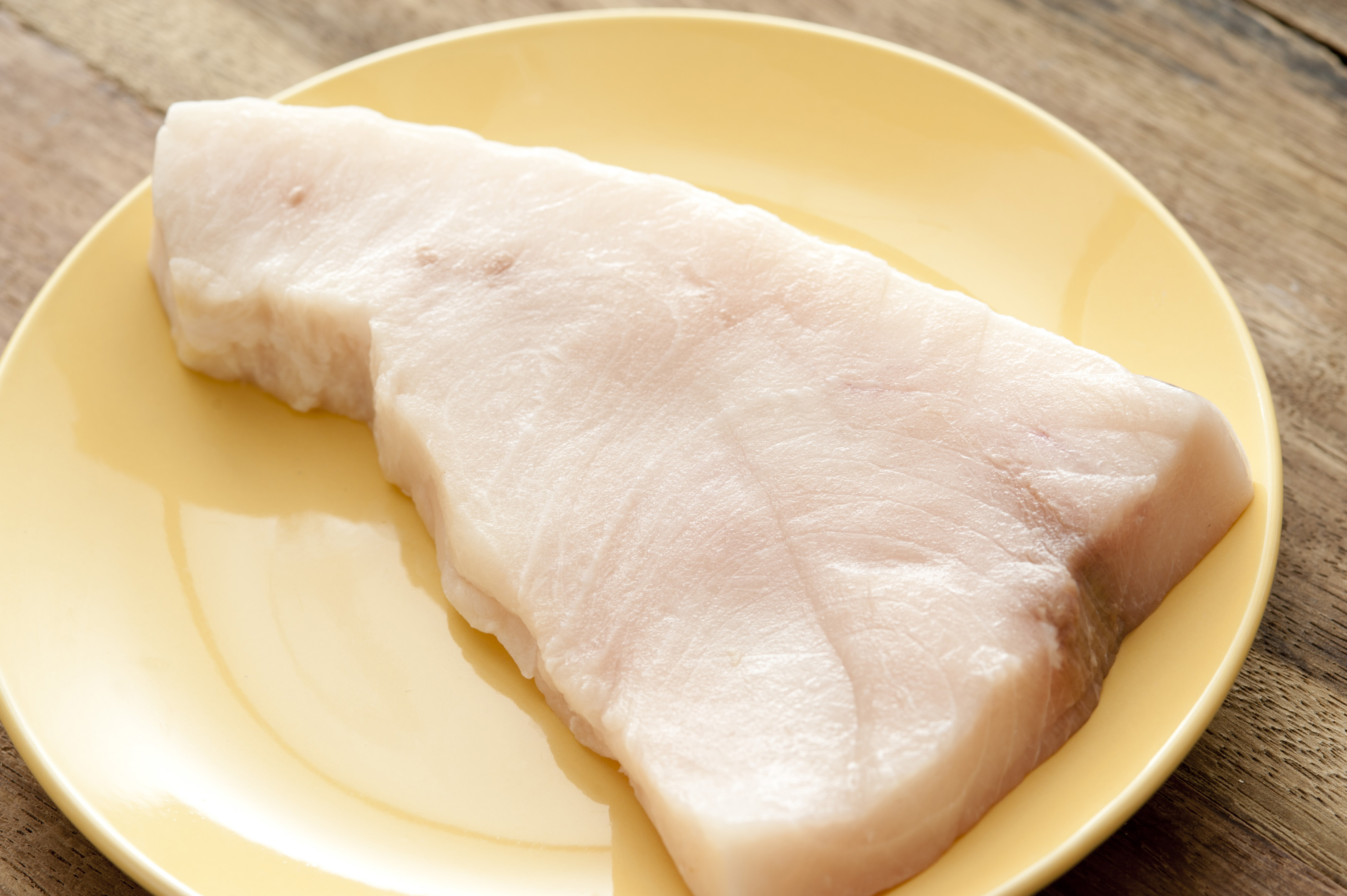 Top down close up view on single Triangle shaped piece of raw swordfish meat in the middle of round yellow china plate