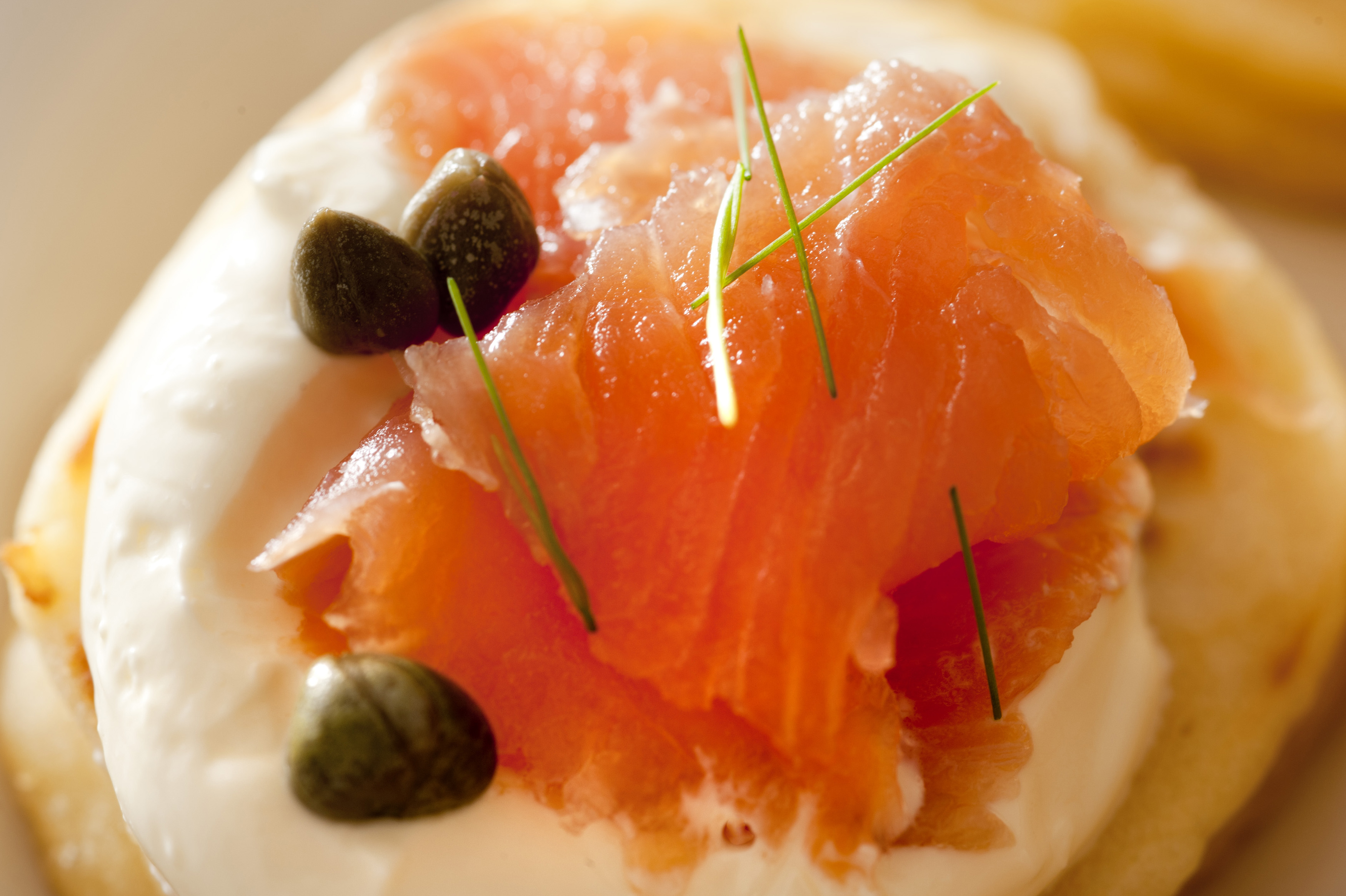 Selective focus macro close up on raw pink salmon meat with capers and herbs on little pancake