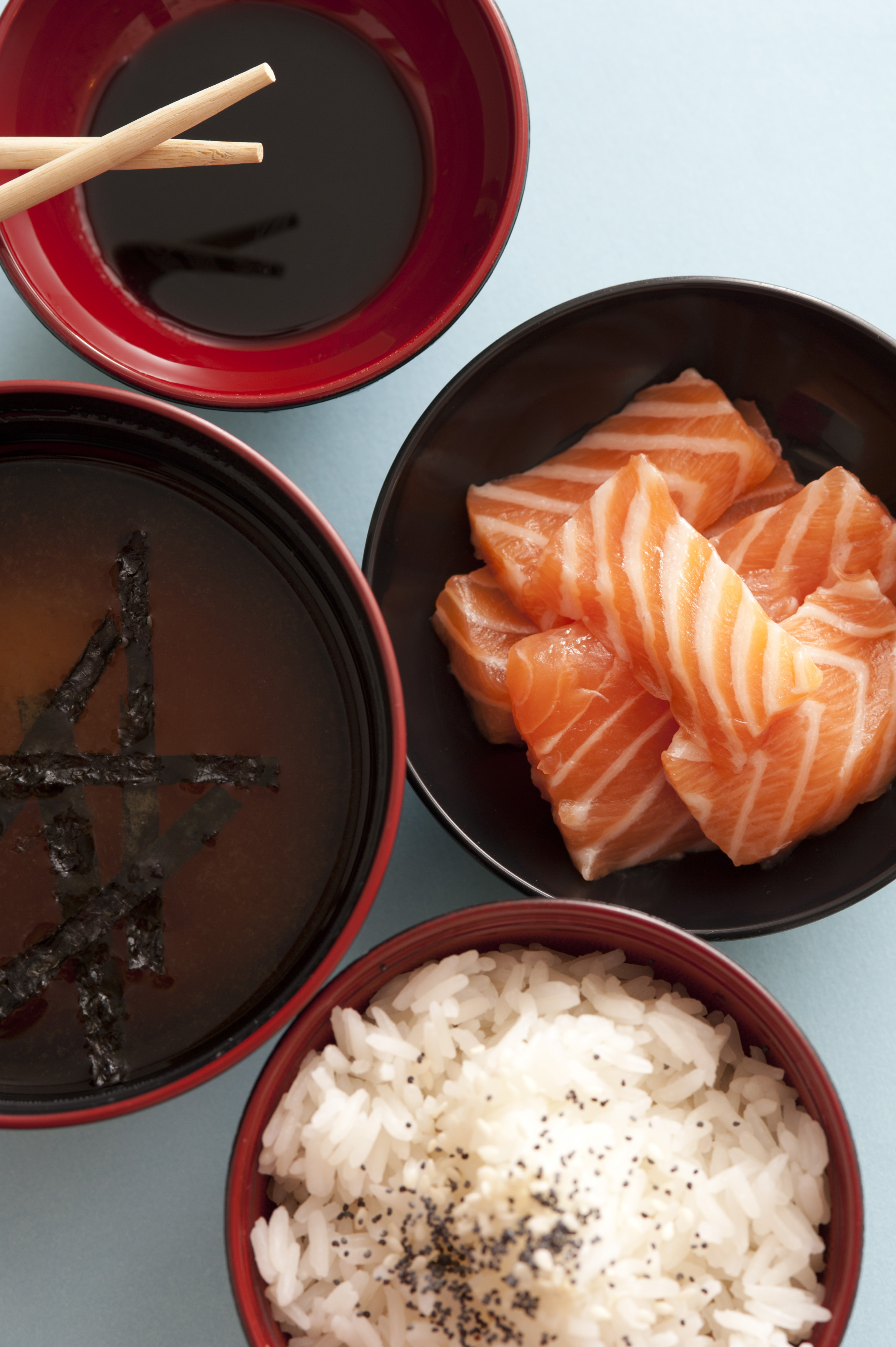 Four bowls of sauce, soup, seasoned white rice and raw fish from first person perspective view