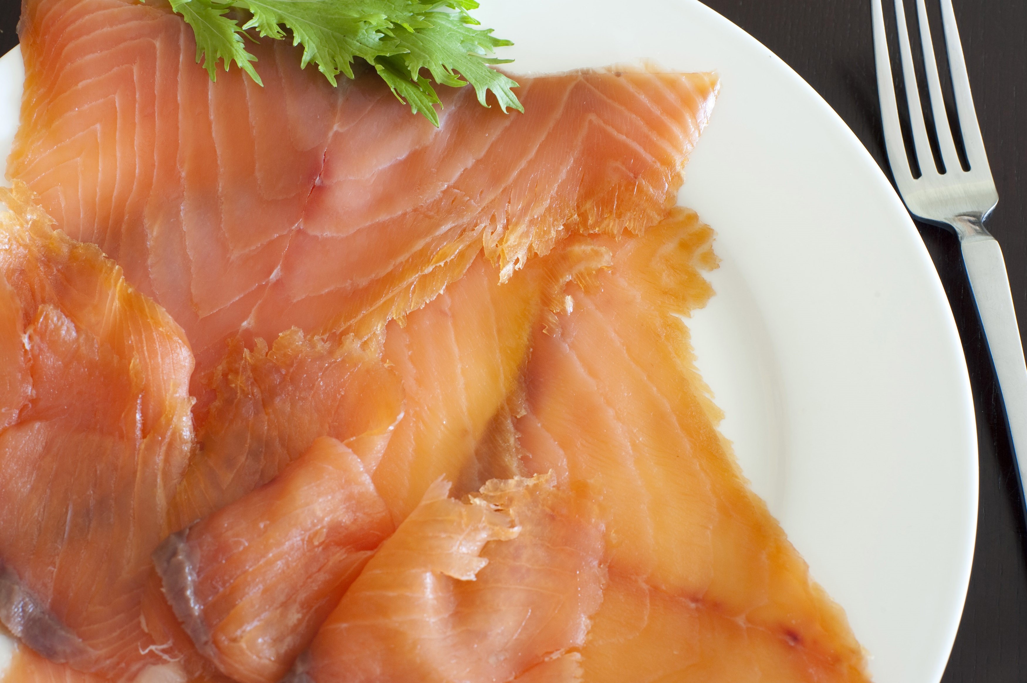 Fresh cured and smoked salmon slices served on a plate for a gourmet seafood dinner, close up overhead view