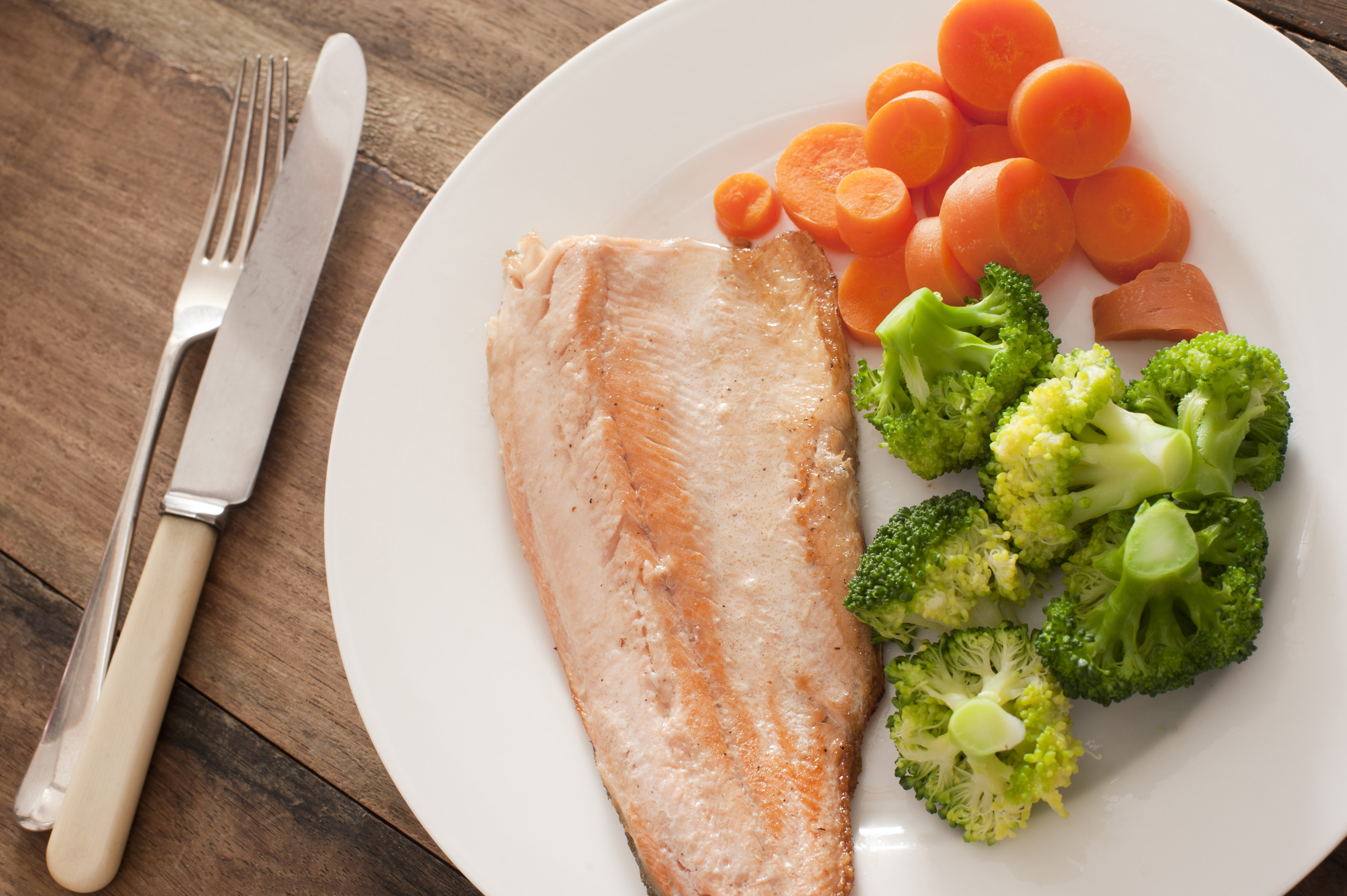 First person perspective view over single round plate of cooked trout dinner with green broccoli and slices of carrots next to fork and knife over wooden table