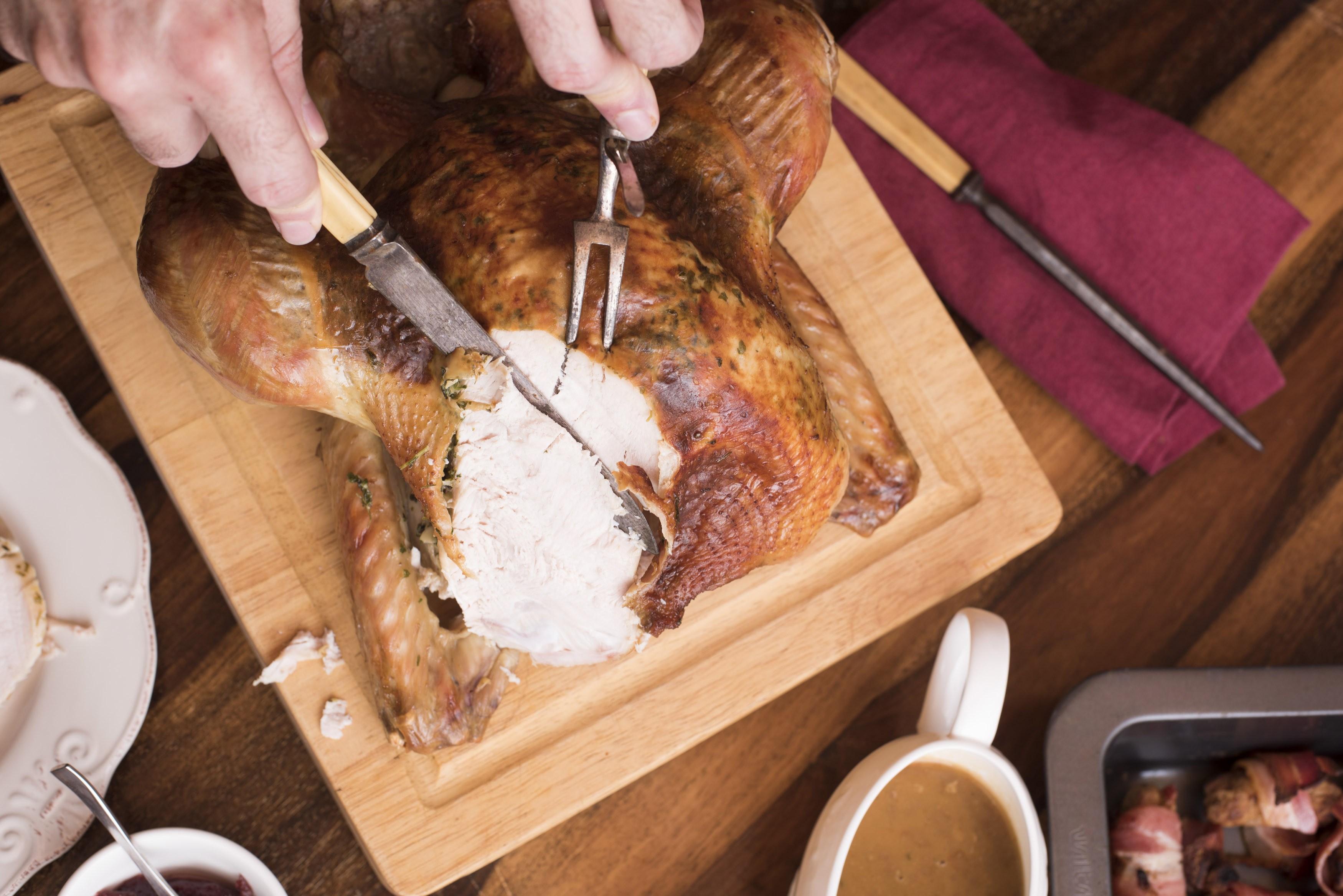Man carving the breast of a Christmas turkey