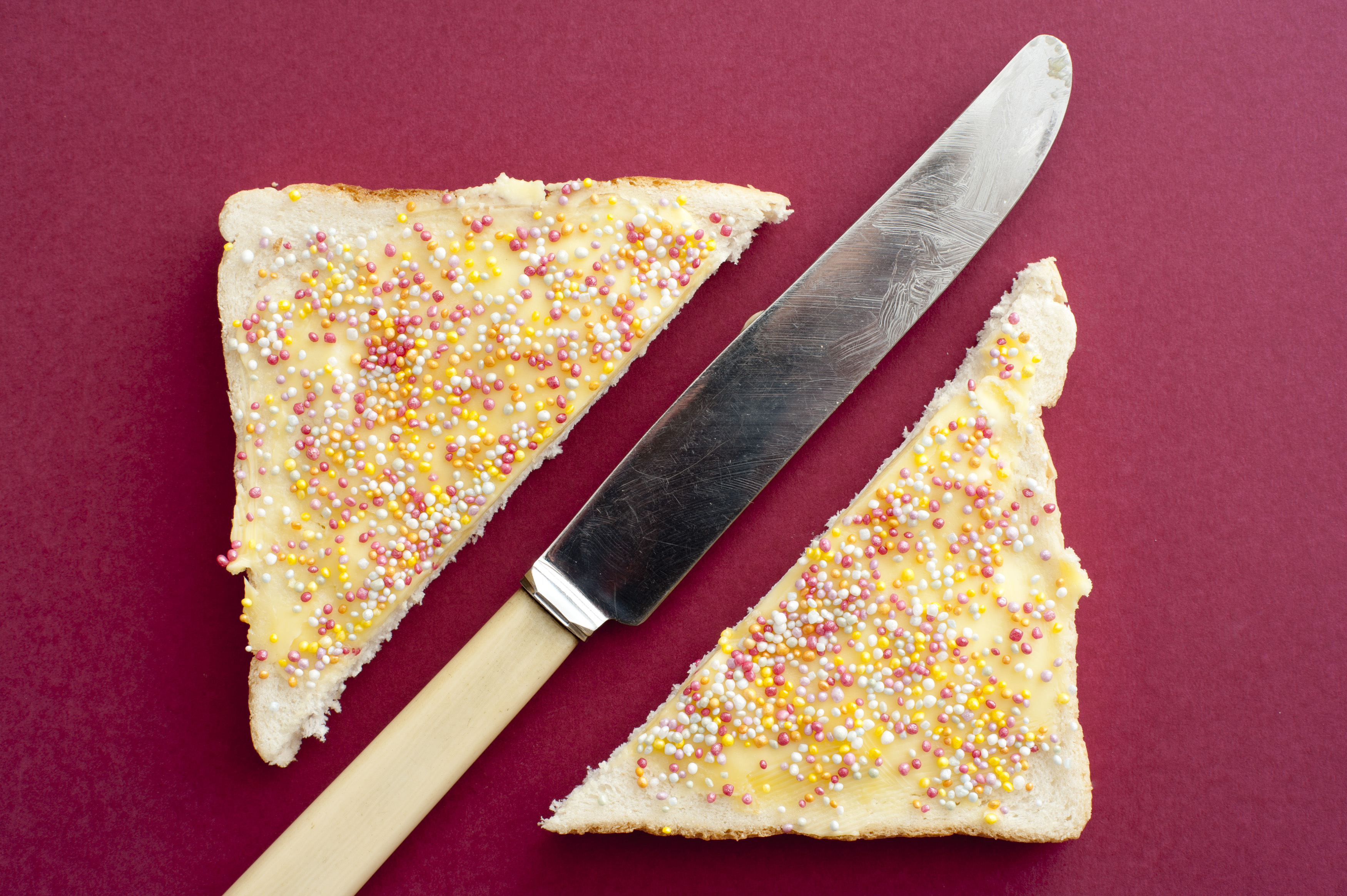 Single butter knife with white handle in between slices of fairy bread covered with butter and candy sprinkling over red background