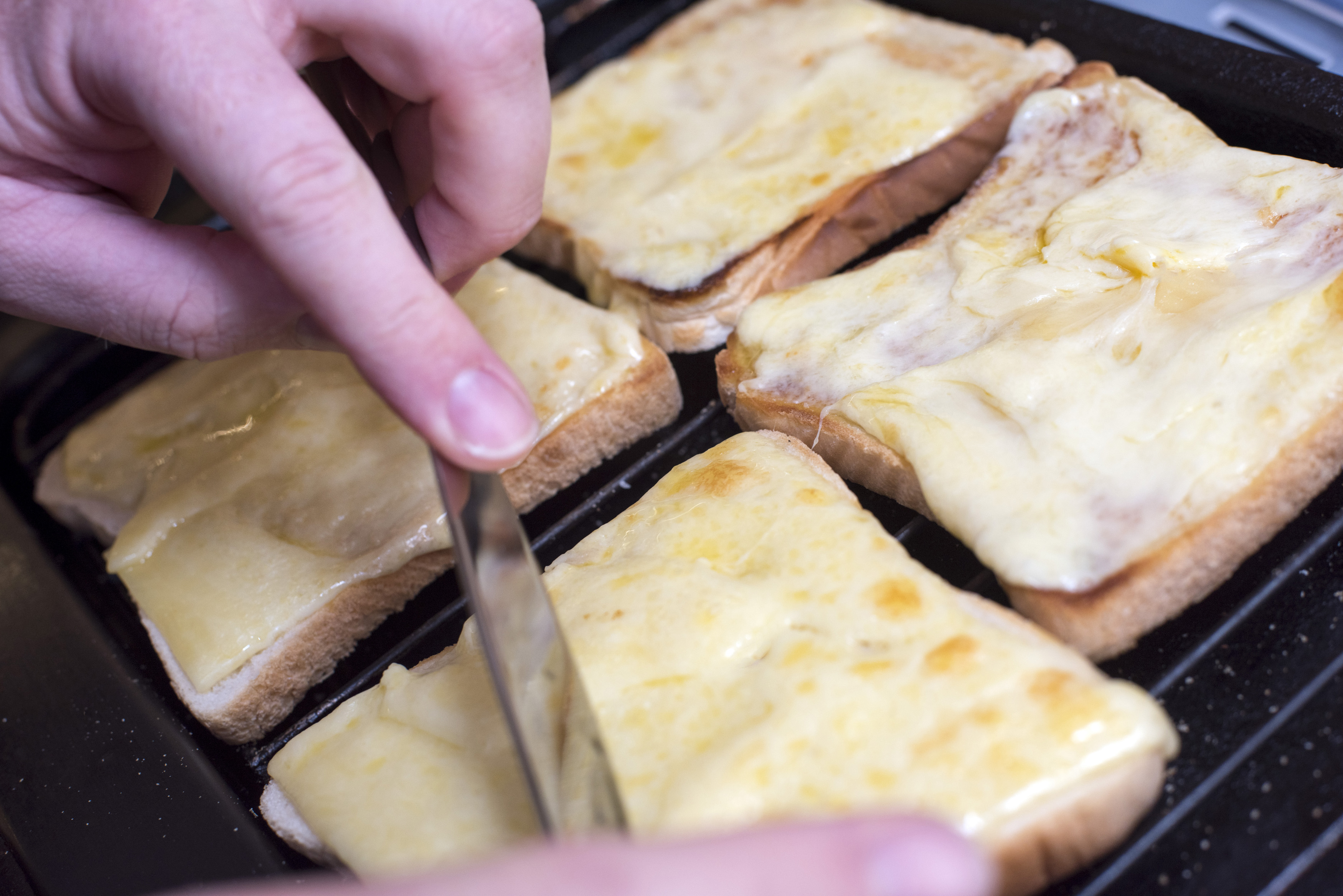 Pair of hands from unidentifiable person preparing four square slices of bread grilled with melted cheese
