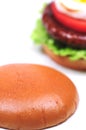 Homemade hamburger or cheeseburger on a fresh sesame bun with a thick juicy beef patty, ketchup, salad trimmings and a slice of cheese