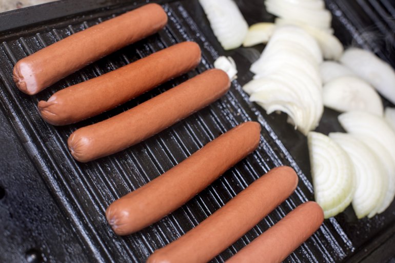 hot dogs and onions grilling