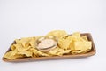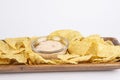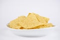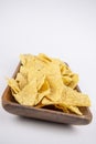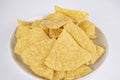 Bowl of traditional triangular corn tortilla chips or nachos for a delicious dipping snack or appetizer in a close up view