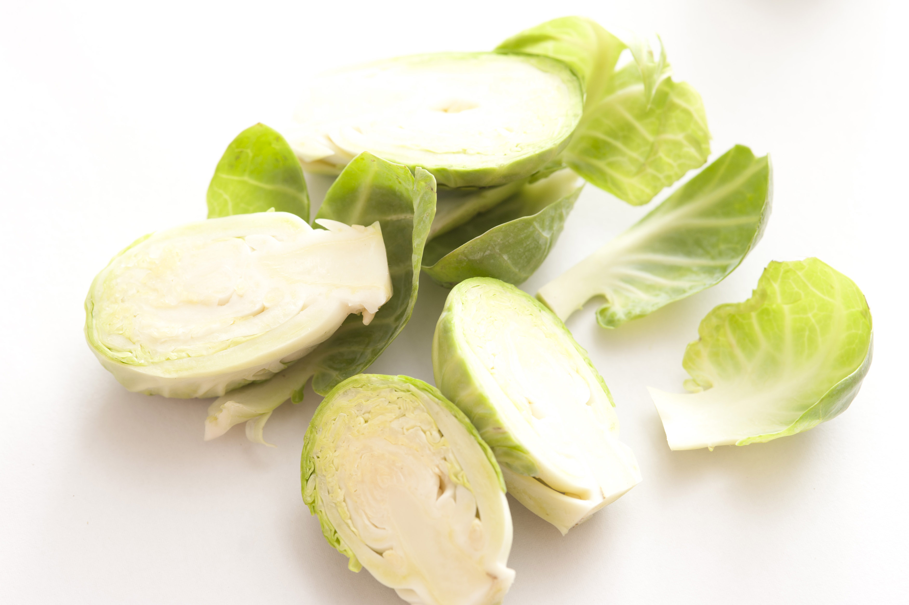 A close up of sliced, prepared brussel sprouts on white background with copy space.