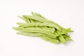 Heap of whole fresh green uncooked string or runner beans viewed low angle over white