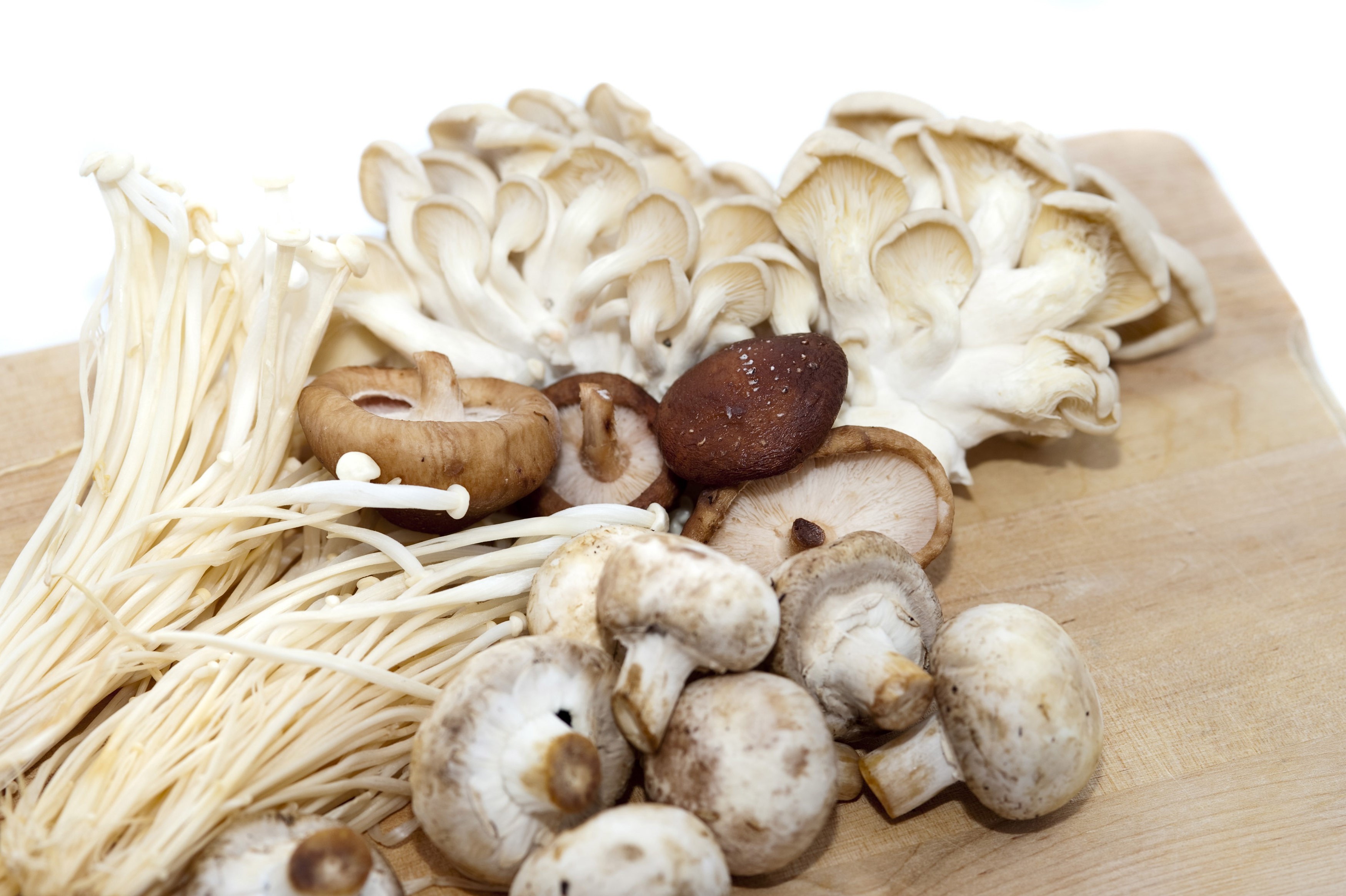 Selection of fresh mushrooms or edible fungi on a wooden chopping board including cultivated agarics and white oyster mushrooms